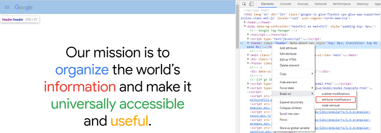 Notice how their top bar goes away when I scroll down, and animates back in when I scroll up. We can set a breakpoint on the DOM by right-clicking on the element from Elements tab > Break On > Attribute Modifications